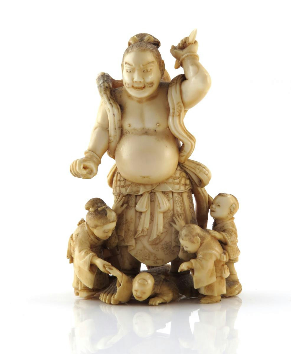 λ A small Japanese ivory carving of a god Meiji 1868-1912, standing with a group of children at his feet, two character signature to the reverse, 7.5cm.