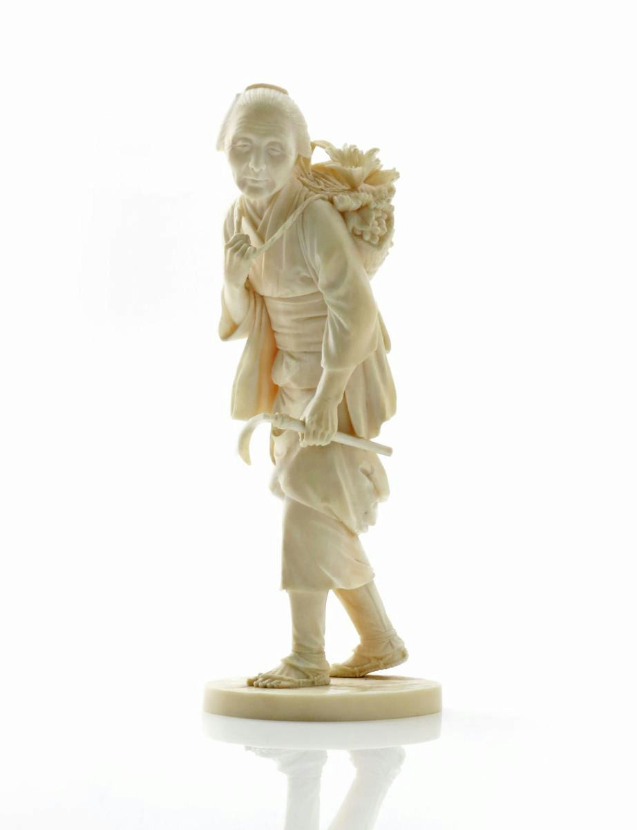 λ A good Japanese ivory okimono Meiji 1868-1912, depicting an elderly woman carrying a basket of grapes and flowers on her shoulders, a sickle in her left hand, signed with a two character mark to the base, 18.4cm.