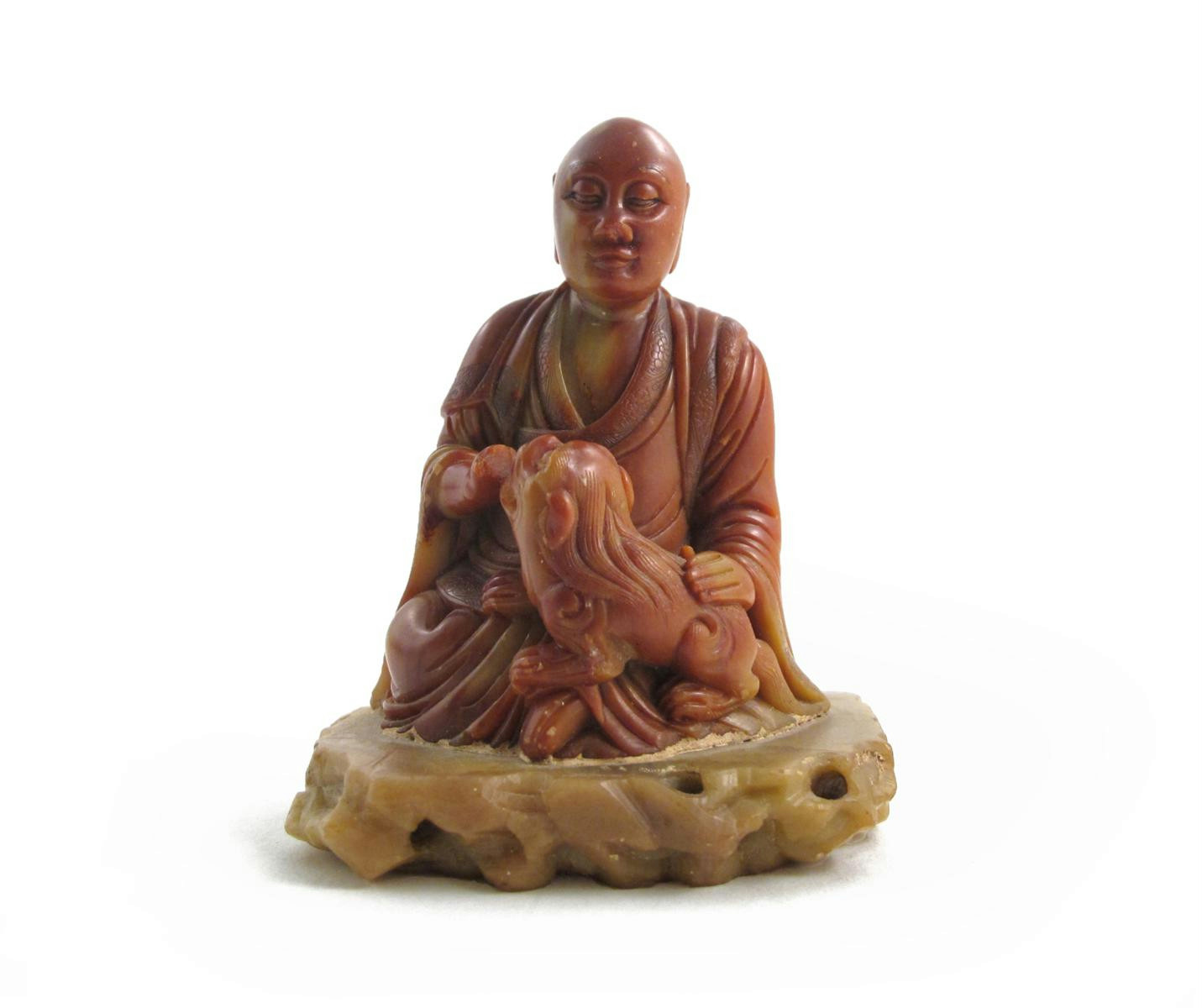 A small Chinese soapstone figure of a luohan 18th/19th century, seated with a Buddhist lion dog on his lap, and raised on a flat base with an irregular border, 8cm.