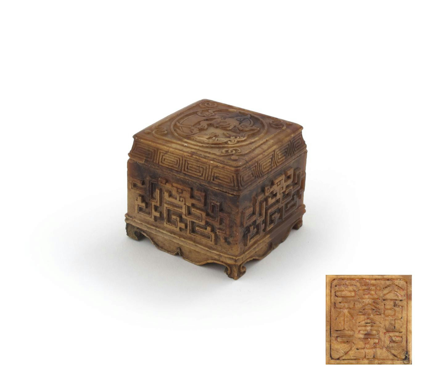 A Chinese soapstone box and cover 19th century, carved in relief with a roundel containing a dragon to the cover, the sides with key fret and geometric designs, raised on short scrolling feet, the base with a six character mark which reads qi shi jing han qian gu qiu, 6cm. (2)