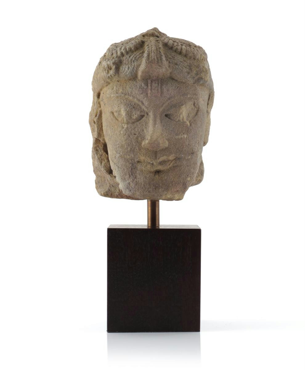 A small Indian sandstone head c.10th-12th century, the features symmetrically carved and with an elaborate headdress, raised on a modern hardwood plinth,14cm. (2)