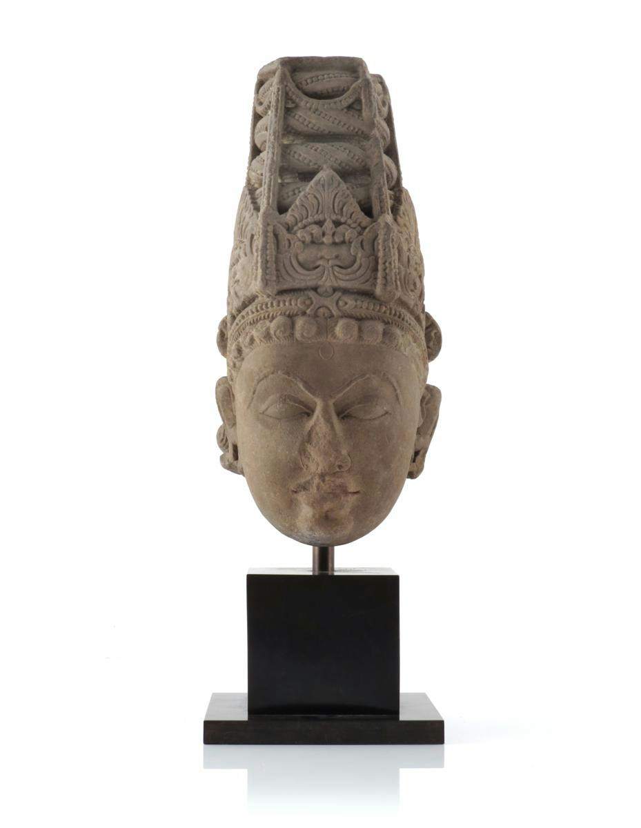 An Indian sandstone carving of the head of a deity c.10th-12th century, the features finely defined beneath a tapering elaborate tiered headdress, raised on a modern plinth, 28cm. (2)