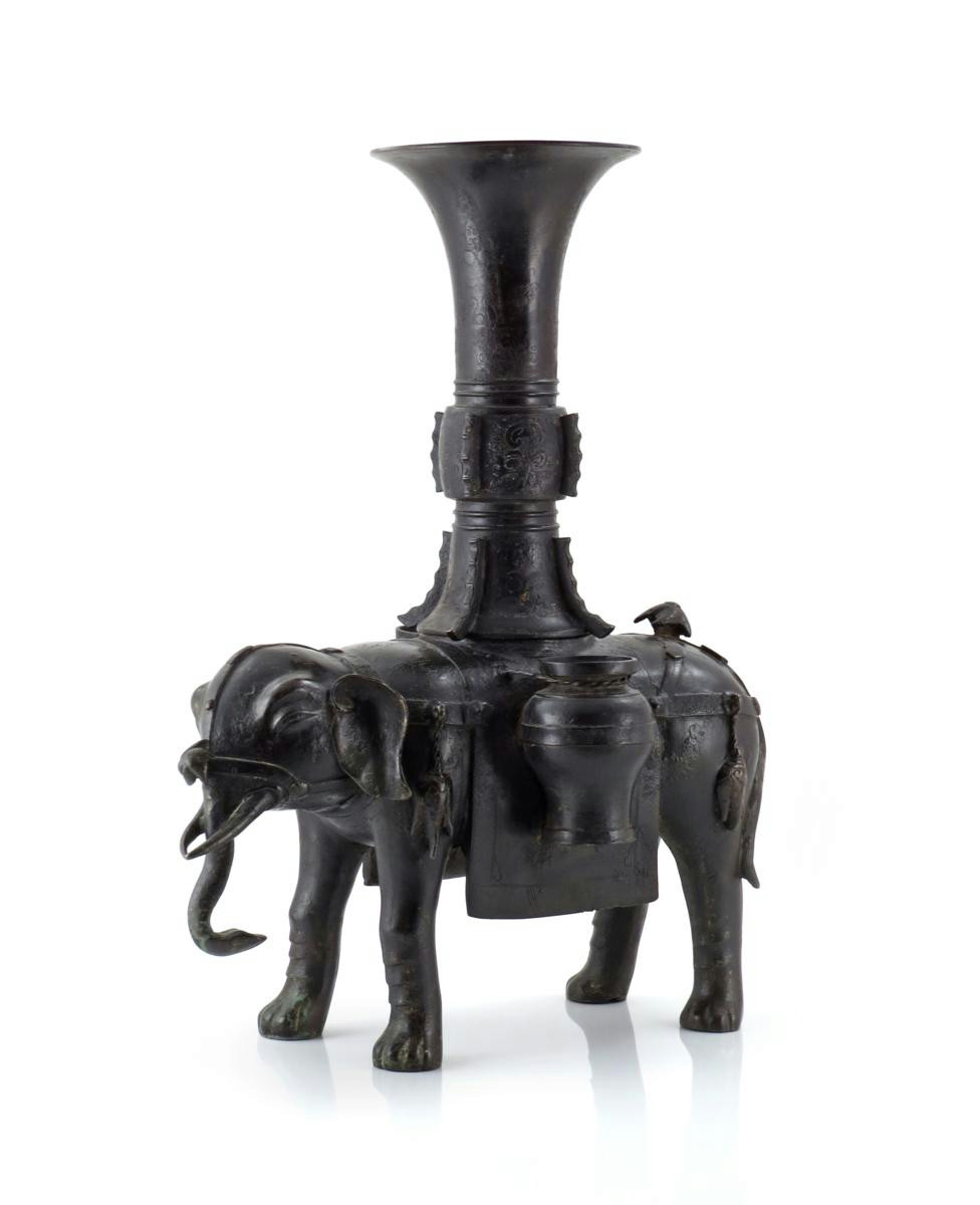 A massive Chinese bronze model of an elephant 17th century, standing four-square, with a large detachable gu beaker vase on its back and with two other vases bound to its sides, 64cm. (2)