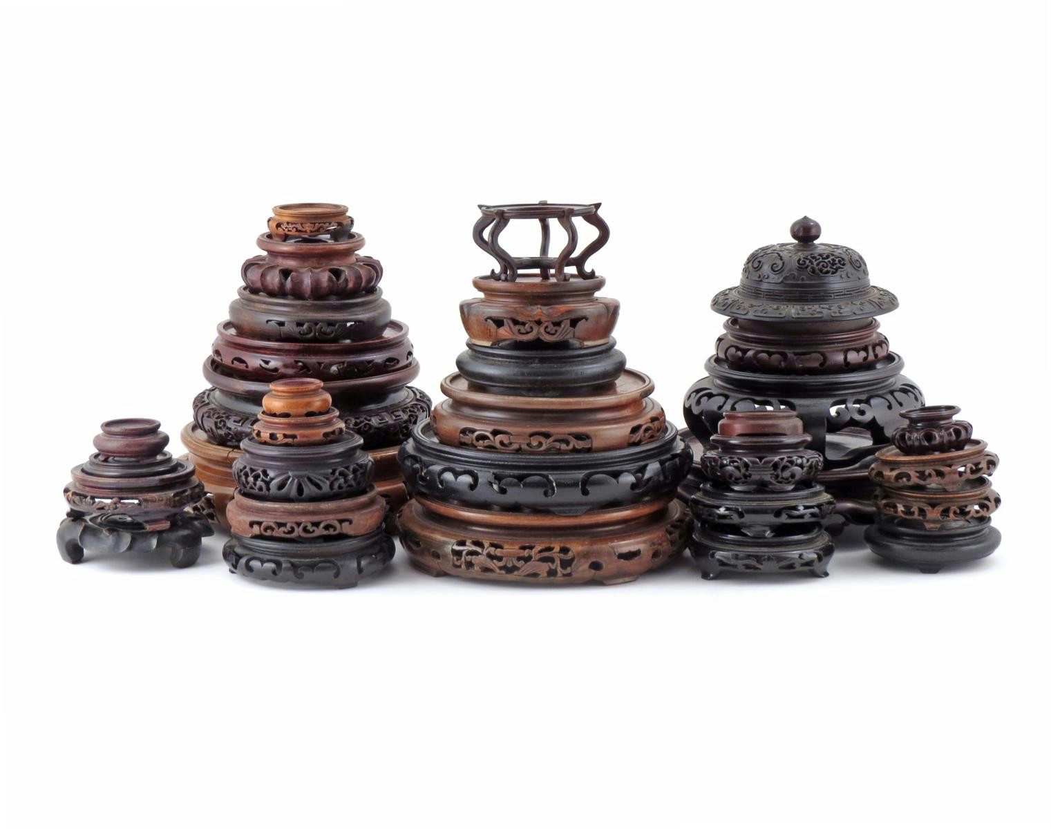 A collection of Chinese hardwood stands and a single hardwood cover 19th and 20th century. (33)