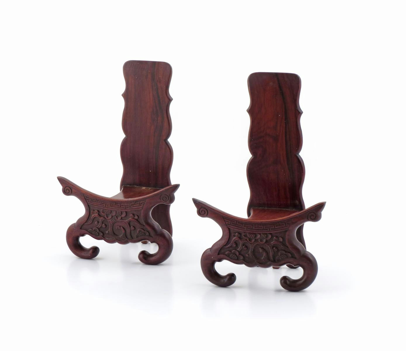 A pair of Chinese hardwood plate stands 19th century, the front panel with curved feet and carved in relief with flowering prunus beneath a band of key fret, 28cm. (2)