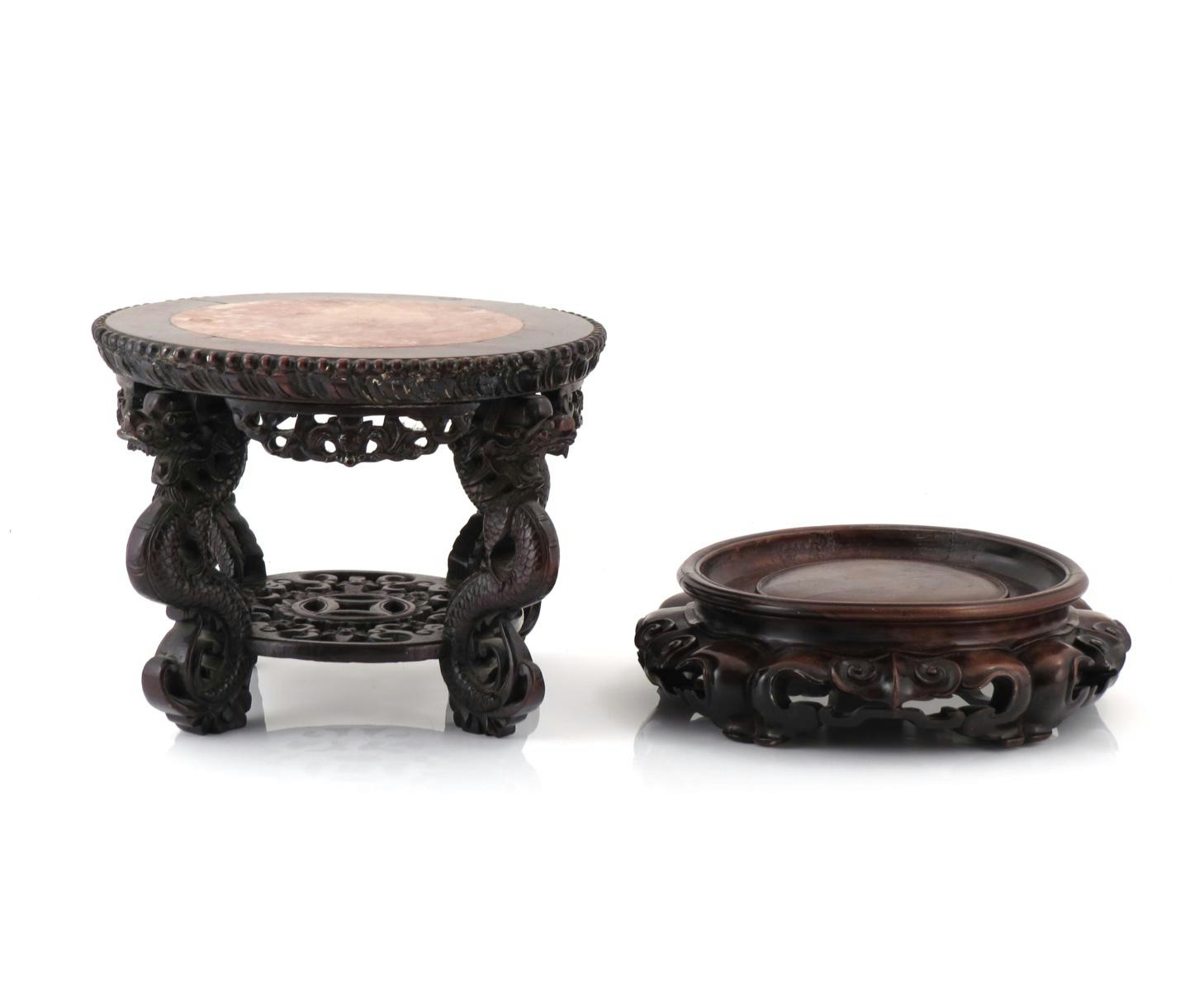 Two Chinese hardwood stands 19th century, one carved with reticulated scrolling panels, raised on five curved feet, the other with a circular top inlaid with a marble panel, raised on four elaborate dragon feet joined by a reticulated circular stretcher, carved with a foliate design encircling a cash symbol, 33.5cm max. (2)