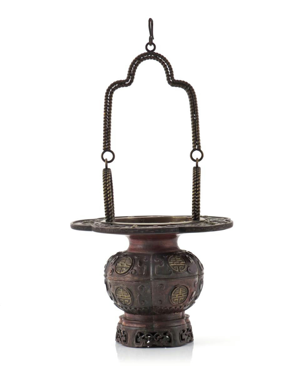 A Chinese hardwood hanging basket late Qing dynasty, with a wide flat rim and a globular body, decorated in brass inlay with bats and shou characters, suspended by a brass rope-twist handle, 31cm.