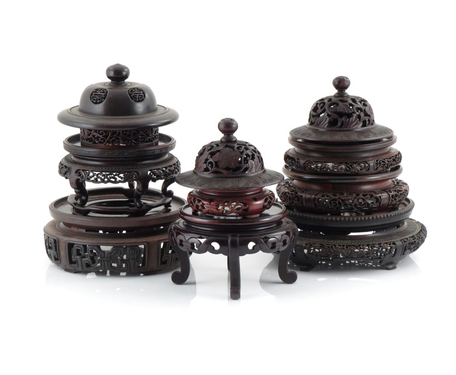 A small collection of Chinese hardwood stands and covers 19th/20th century, comprising: seven stands and four covers, of various shapes, all reticulated and carved with designs of flowers, foliage, shou characters and stylized scrolls, 25.5cm max. (11)