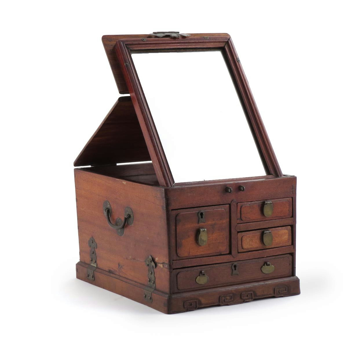 A Chinese hardwood vanity chest 19th century, the hinged top enclosing a mirror, the front with an arrangement of four drawers, with coper and brass mounts, 20cm x 32cm x 24.5cm.