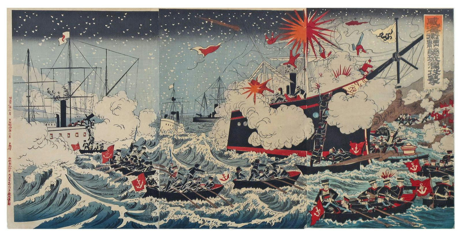 A collection of framed Japanese woodblock prints, including three triptychs by Utagawa Kokunimasa depicting the Sino-Japanese War, a print of an itinerant monk by Utagawa Kunisada, and two other prints showing men fighting, oban tate-e, 37cm x 70.4cm max. (6)