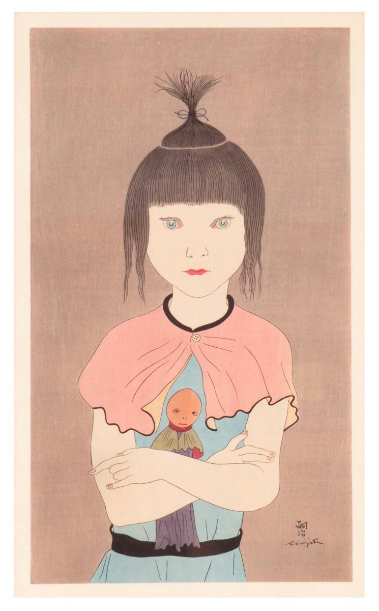 λ Three Japanese woodblock prints by Léonard Tsuguharu Foujita 20th century, depicting a girl with her doll, another of a young woman in a European dress, the third a self-portrait of the artist with a cat on his shoulder, all framed, 39cm x 26cm. (3)