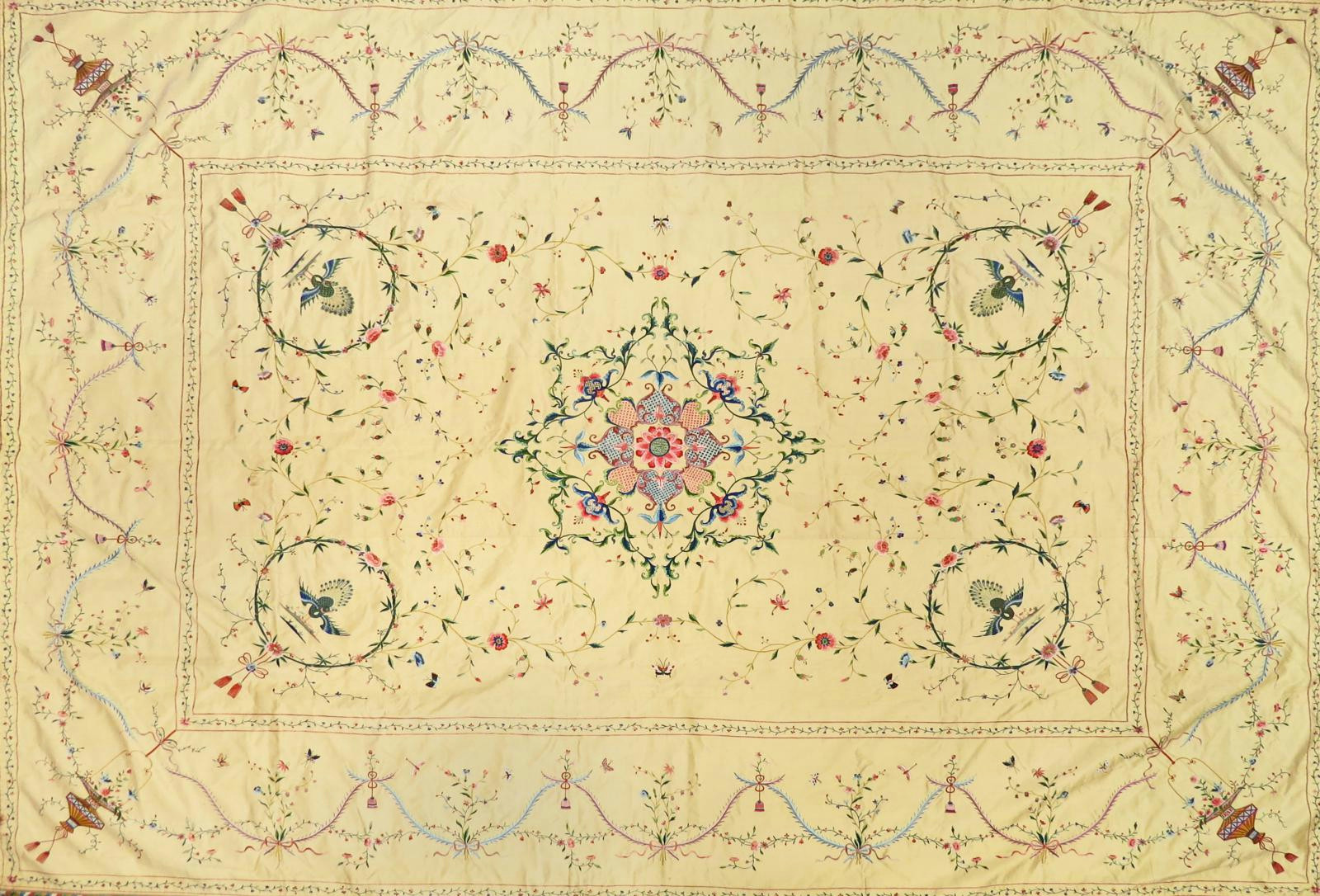A pale yellow Indian silk embroidered panel 19th century, decorated with a central stylized motif and four circular panels containing peacocks, the border with leafy festoons and hanging lanterns, 240cm x 184cm.