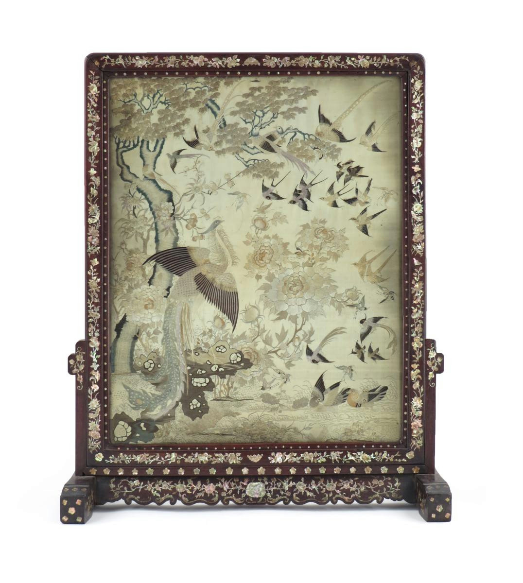 A Chinese standing screen 19th century, the hardwood frame inlaid with mother of pearl, enclosing an embroidered silk panel depicting a phoenix and many other birds beneath a tree, 93cm x 76.5cm.