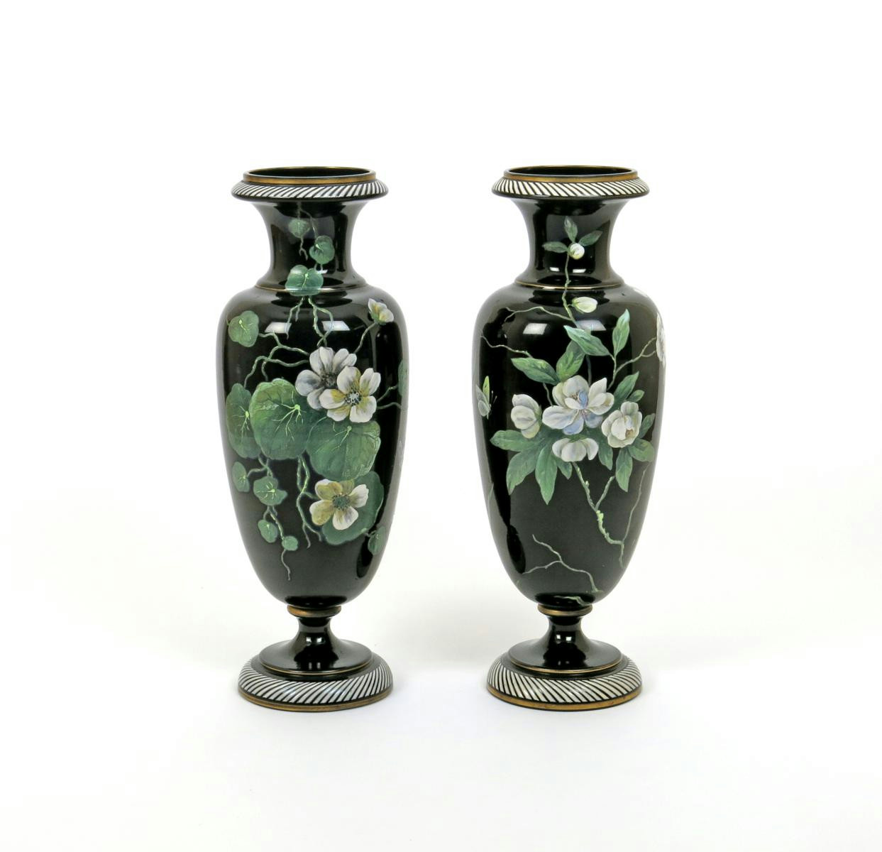 A tall pair of black glass vases 19th century, painted with branches of white flowers, small butterflies about, the feet and necks with spiralling white enamel, 41cm. (2)