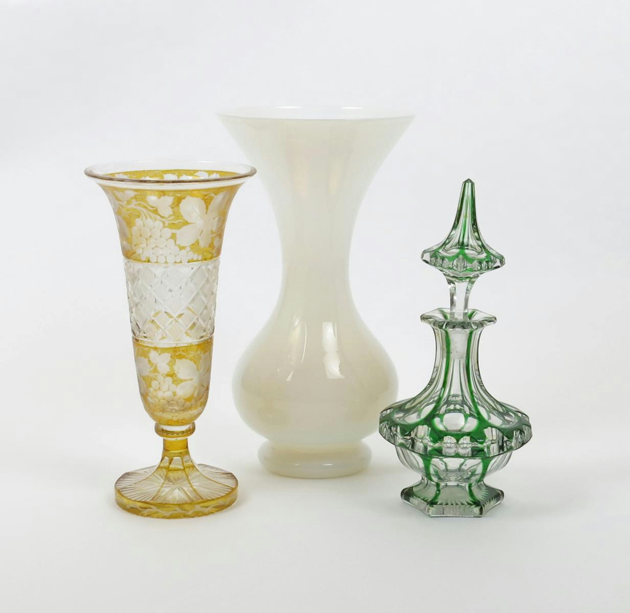 A Bohemian glass bottle and stopper 19th century, of squat hexafoil form, flashed in emerald and cut, a tall vase flashed in amber and cut with bands of grapevine, and an opaline glass vase of milky white tone, 30cm max. (4)