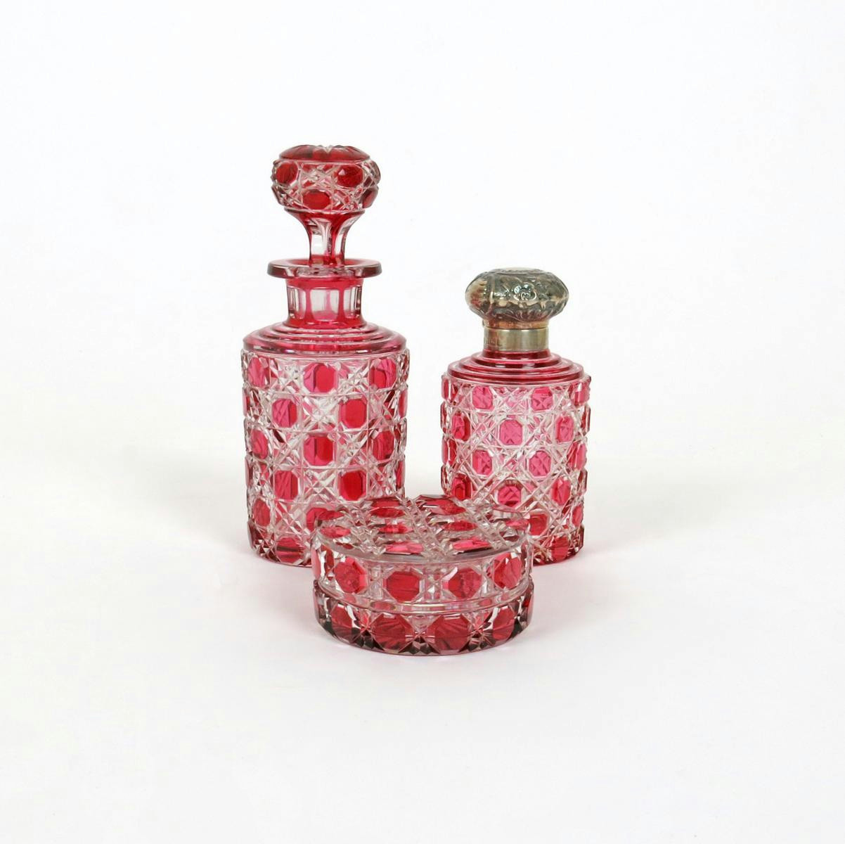 Two ruby-flashed and cut glass scent bottles 20th century, the cylindrical bodies with hobnail cutting and stepped necks, one with a globular stopper, the other with an inner stopper and silver hinged lid, together with a matching circular box and cover, the silver hallmarked for Birmingham 1995 and possibly later, 18cm max. (5)