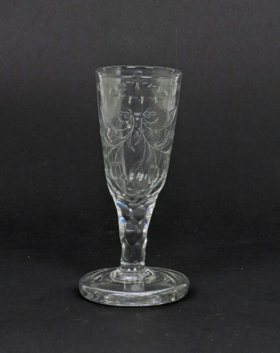 A rare cider glass with firing foot 2nd half 18th century, engraved and cut with branches of polished apples, beneath polished circle swags, the reverse with a large bee, raised on a faceted stem above a thick firing foot, 16.2cm.