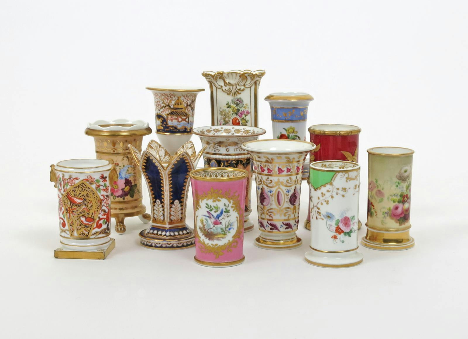 Twelve various English porcelain spill vases most 19th century, including Spode, Minton, Copeland, Charles Bourne and Hicks & Meigh, variously decorated with flowers, Imari designs, stylized patterns and applied bamboo, 14.5cm max. (12)