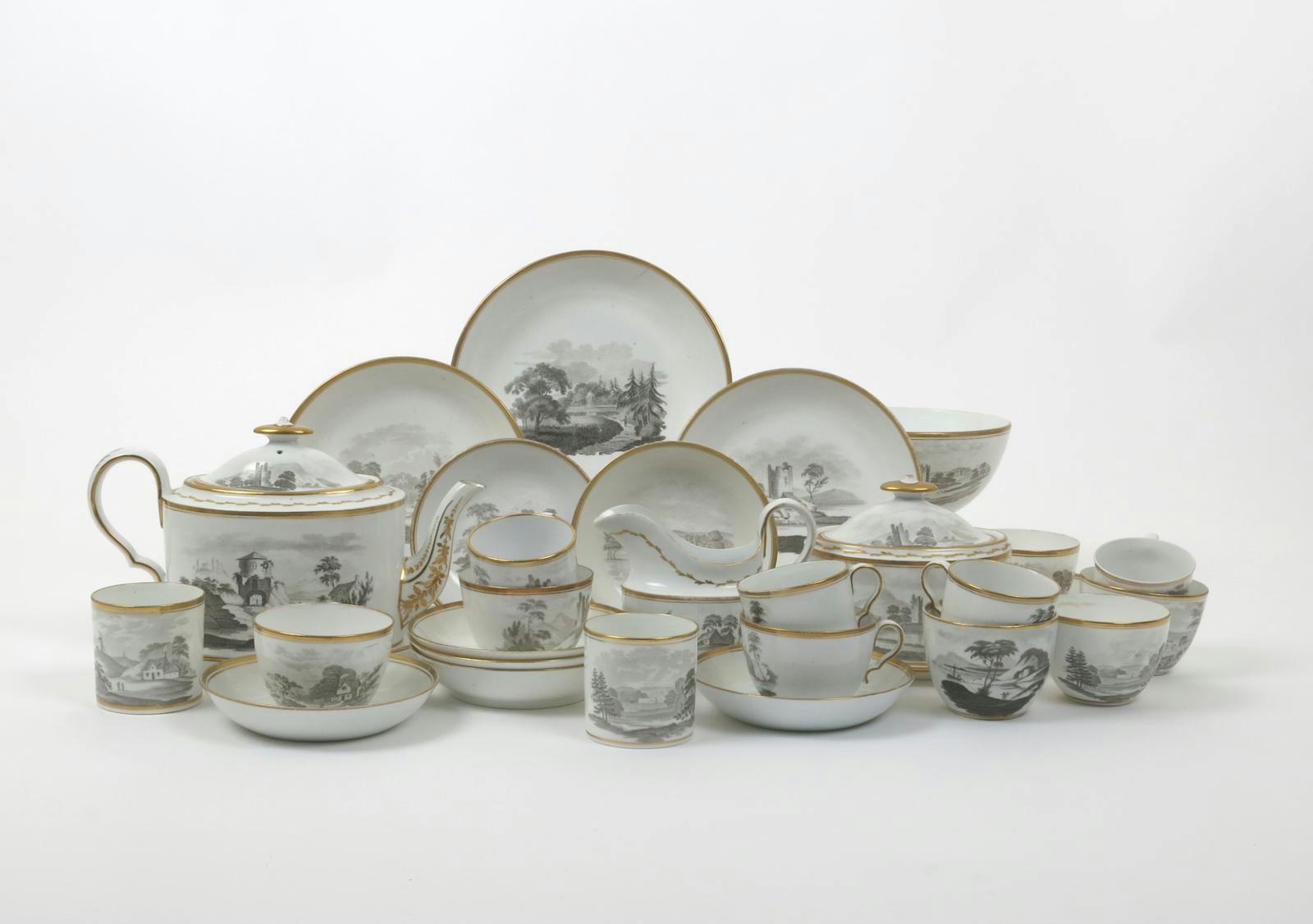 A Spode tea service c.1810, bat-printed in pattern 557 with small figures before ruins or thatched cottages in rural landscape scenes. Comprising: a teapot with cover and stand, a sugar basin with cover and stand, a milk jug, a slop bowl, one large and two small cake plates, eight tea cups, eight coffee cans and eight saucers. (35)