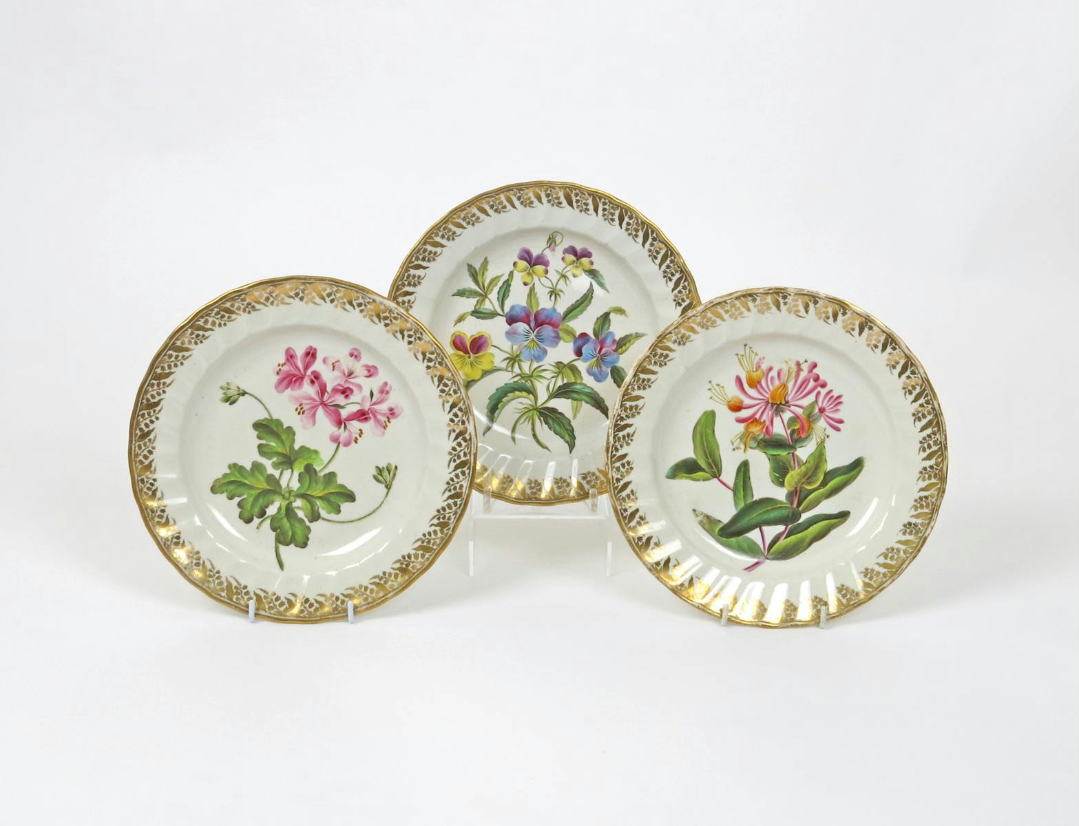 Three Derby botanical dessert plates c.1800, painted in pattern 115 with floral specimens of Heartsease, Honeysuckle and Geranium, within a gilt lily of the valley border, each piece titled to the reverse, blue factory marks and pattern numbers, 23.8cm. (3)