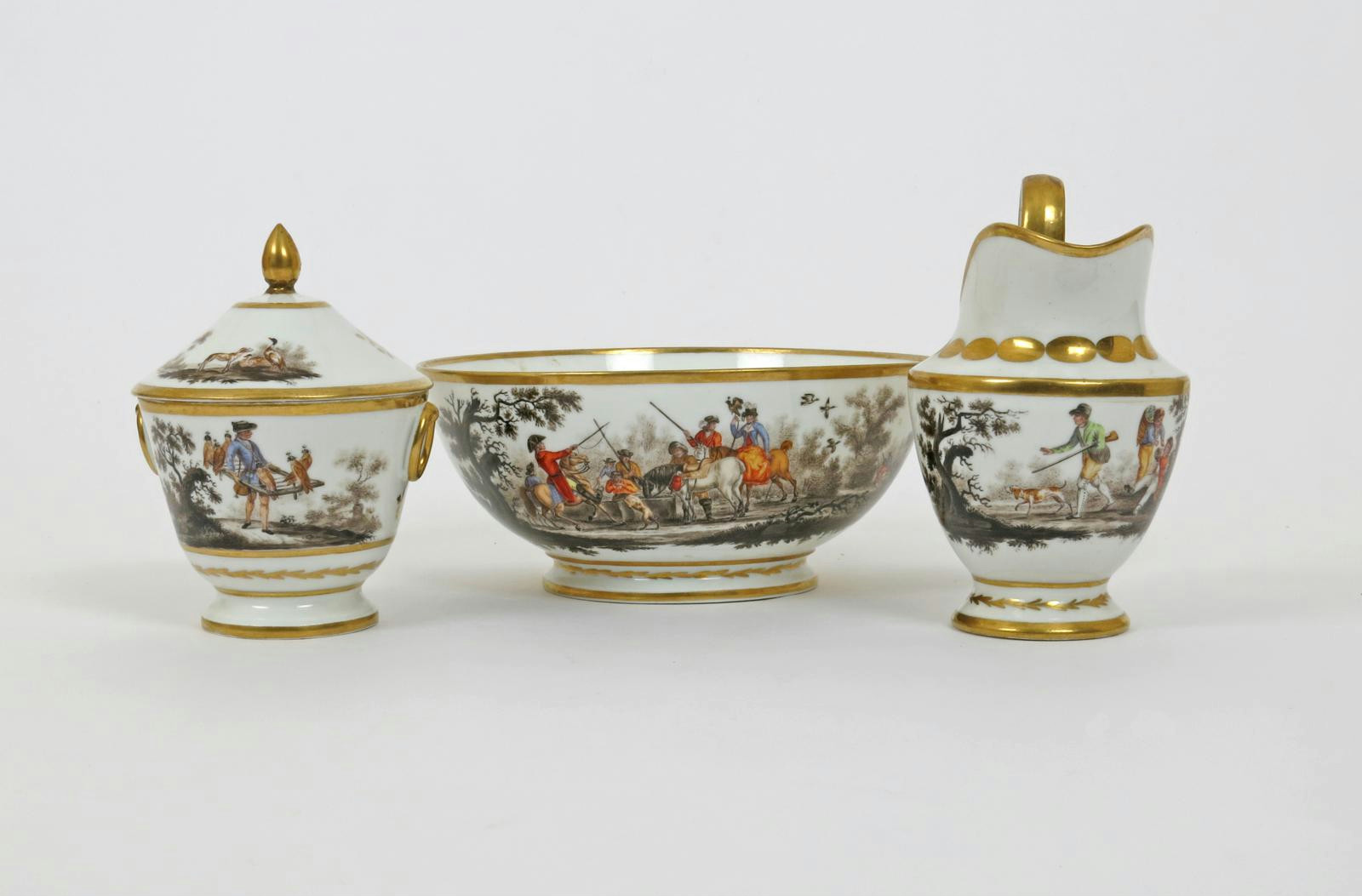 A Paris porcelain part tea service 19th century, painted with various scenes of men hunting with dogs, guns and birds of prey, the reverse of the bowl with a bear leaning against a monument, some damages. Comprising: a sucrier and cover, a milk jug and a slop bowl. (4)
