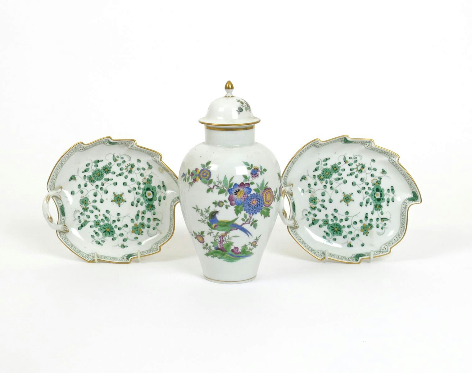 A Meissen ovoid vase and cover 20th century, decorated with a bird perched on a flowering Oriental branch in a palette of blues and greens, and a pair of Meissen leaf dishes, with stylized floral decoration in green and gilt, 24.5cm max. (4)