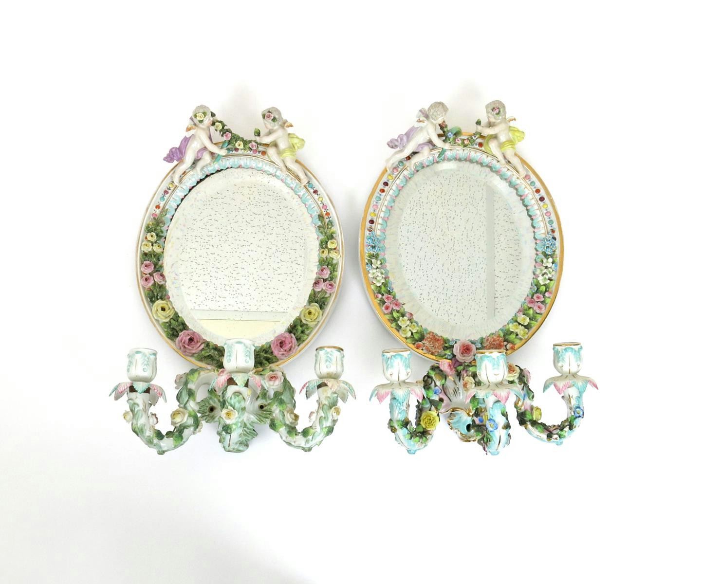 A matched pair of Dresden porcelain mirrored wall sconces late 19th/early 20th century
