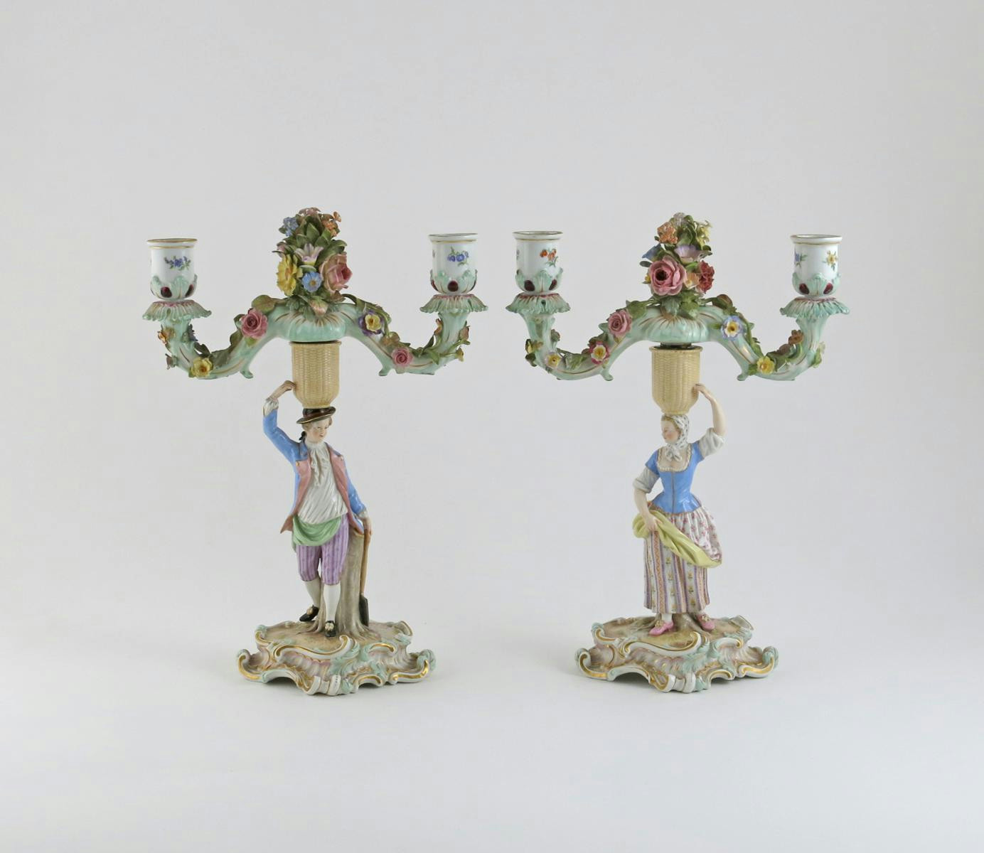 A pair of Meissen candlestick figures 19th century, modelled as a gardener and his companion each supporting a twin branch candlestick set within a basket on each head, raised on low scrolling bases, blue crossed swords marks, incised B76, 29cm. (4)