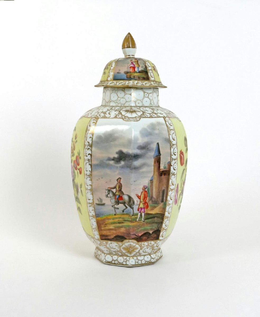 A massive Dresden porcelain octagonal vase and cover 19th century, one side painted with two musicians beside a ruined castle, the reverse with a figure on horseback in conversation with another figure, alternating with two flower sprays on a primrose yellow ground, some restoration, 53cm. (2)