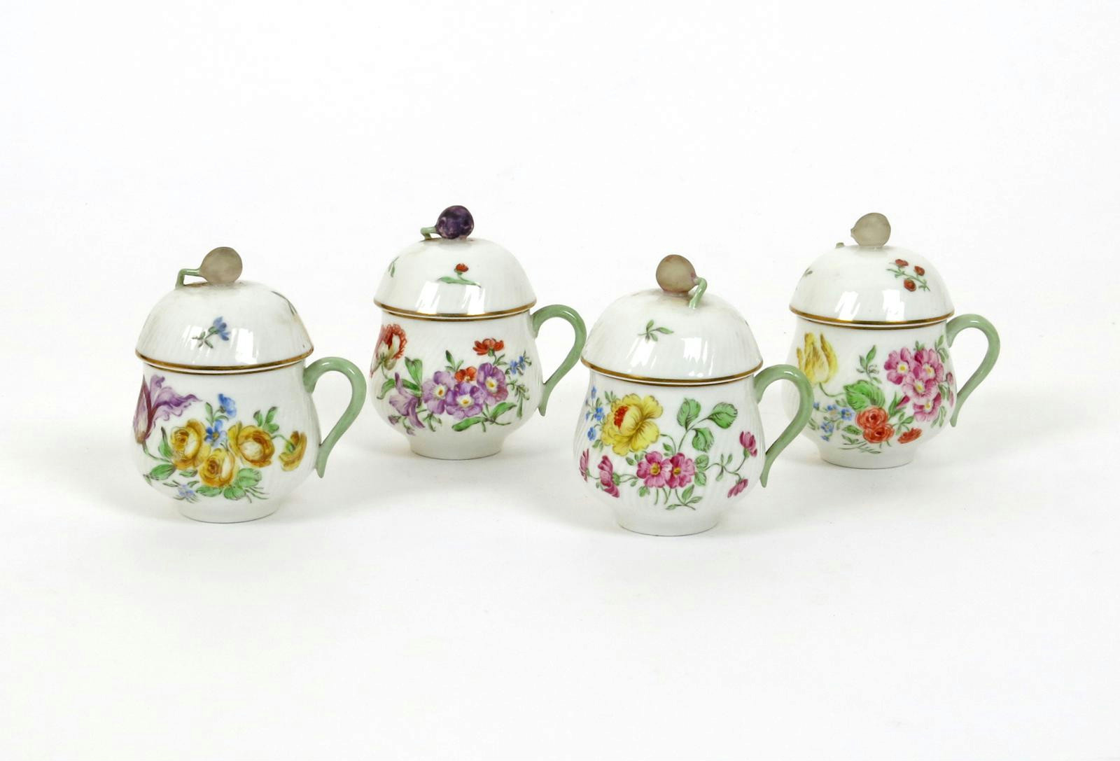 A set of four Rörstrand custard cups and covers late 19th century, the spiral-fluted forms painted with bright flower arrangements, the domed covers with fruit finials, printed marks, a chip to one finial, 10cm. (8)