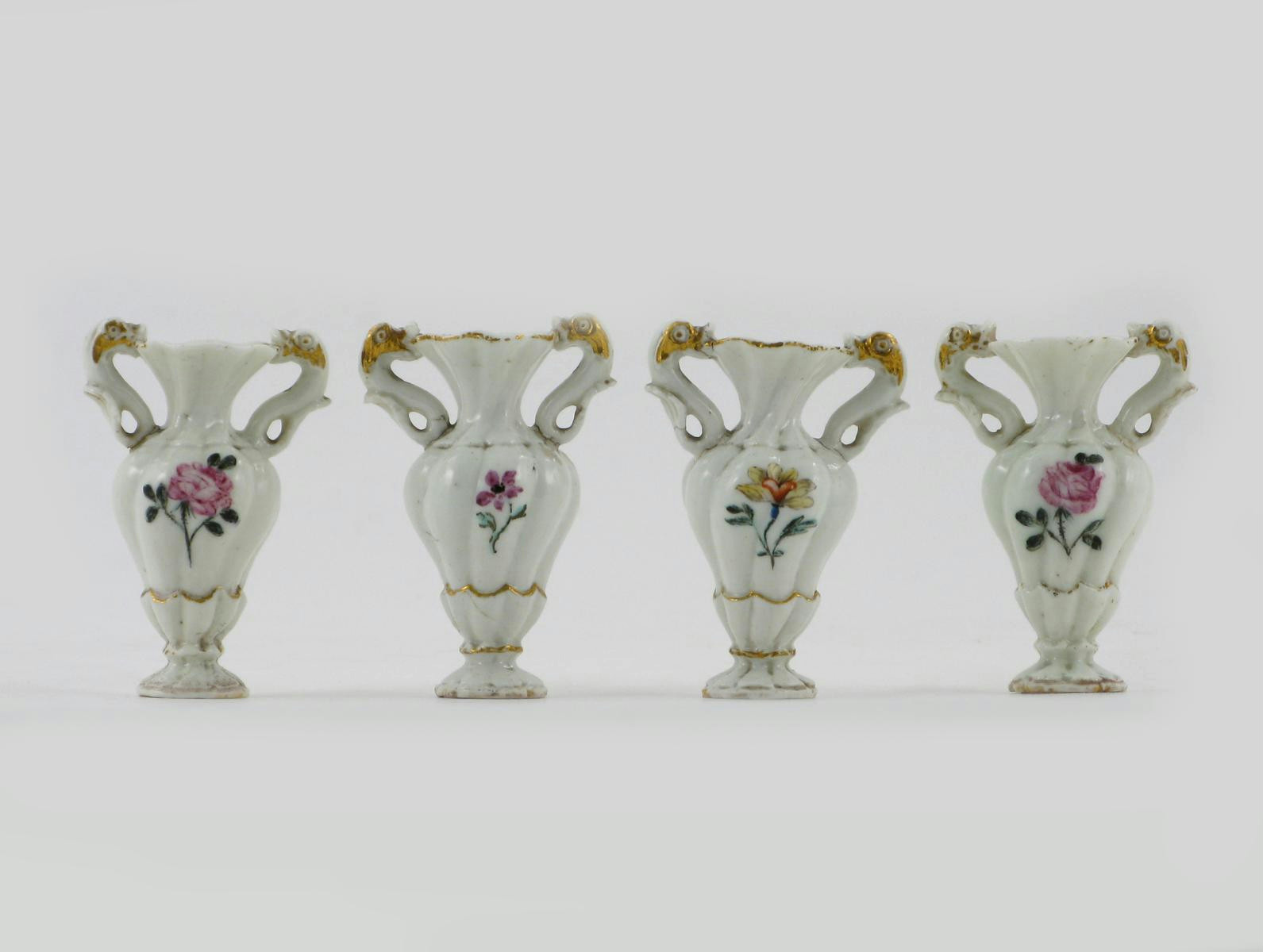 A rare set of four Capodimonte miniature vases c.1750, the spiral moulded bodies painted with differing sprays of single flower stems and surmounted with dolphin handles detailed in gilt, minor faults, 7cm. (4)