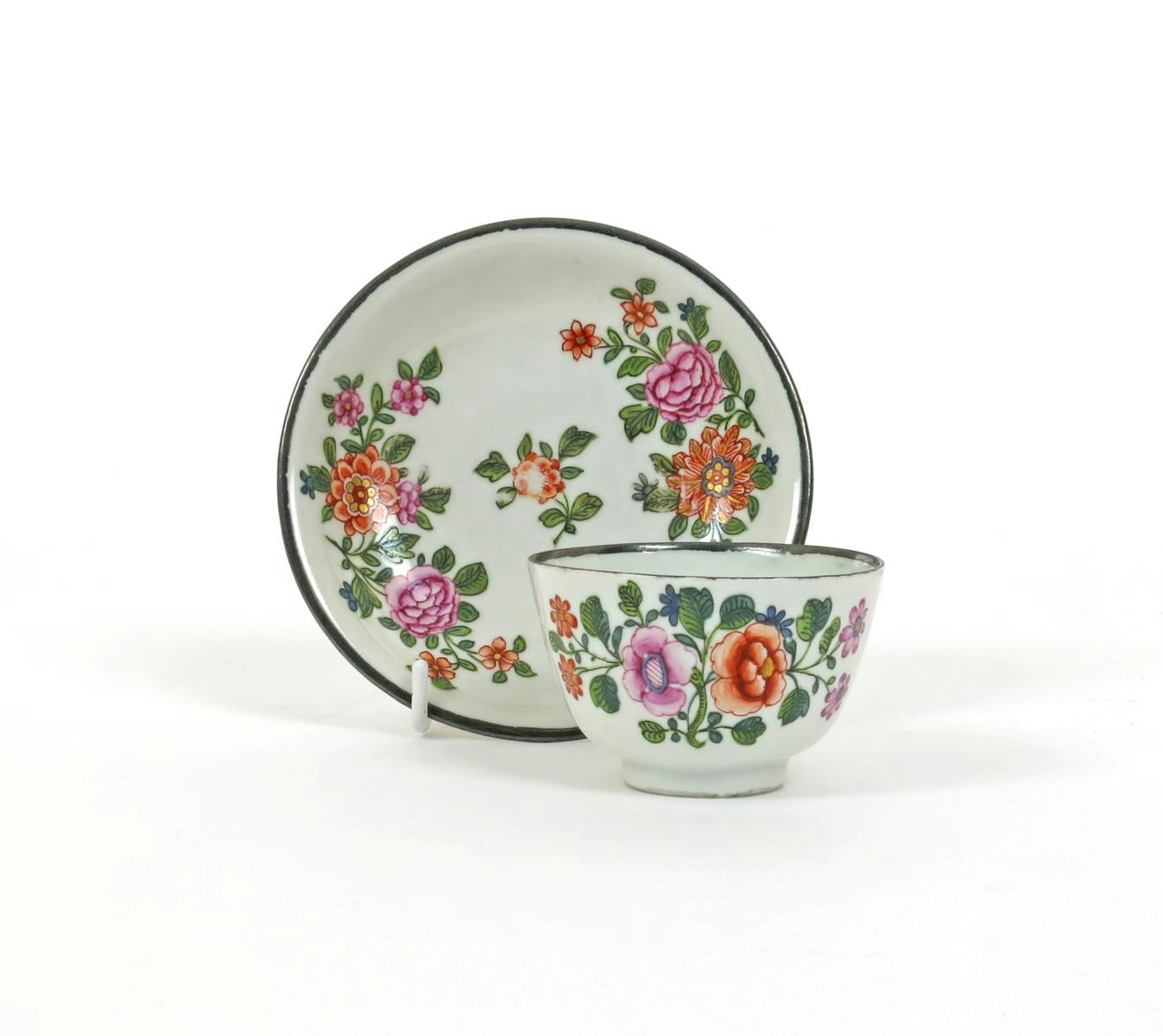 A Du Paquier teabowl and saucer c.1730, brightly decorated with flower sprays in pink, red, blue and green enamels, highlighted with gilt, within black line rims, the underside of the saucer with three iron red flower stalks, 11.5cm. (2)