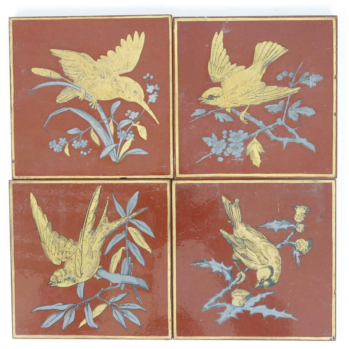 A set of four Minton & Hollins Aesthetic Movement tiles, printed in silver and gold with birds perched on various foliate sprays impressed marks, minor rim nicks, 15cm. square