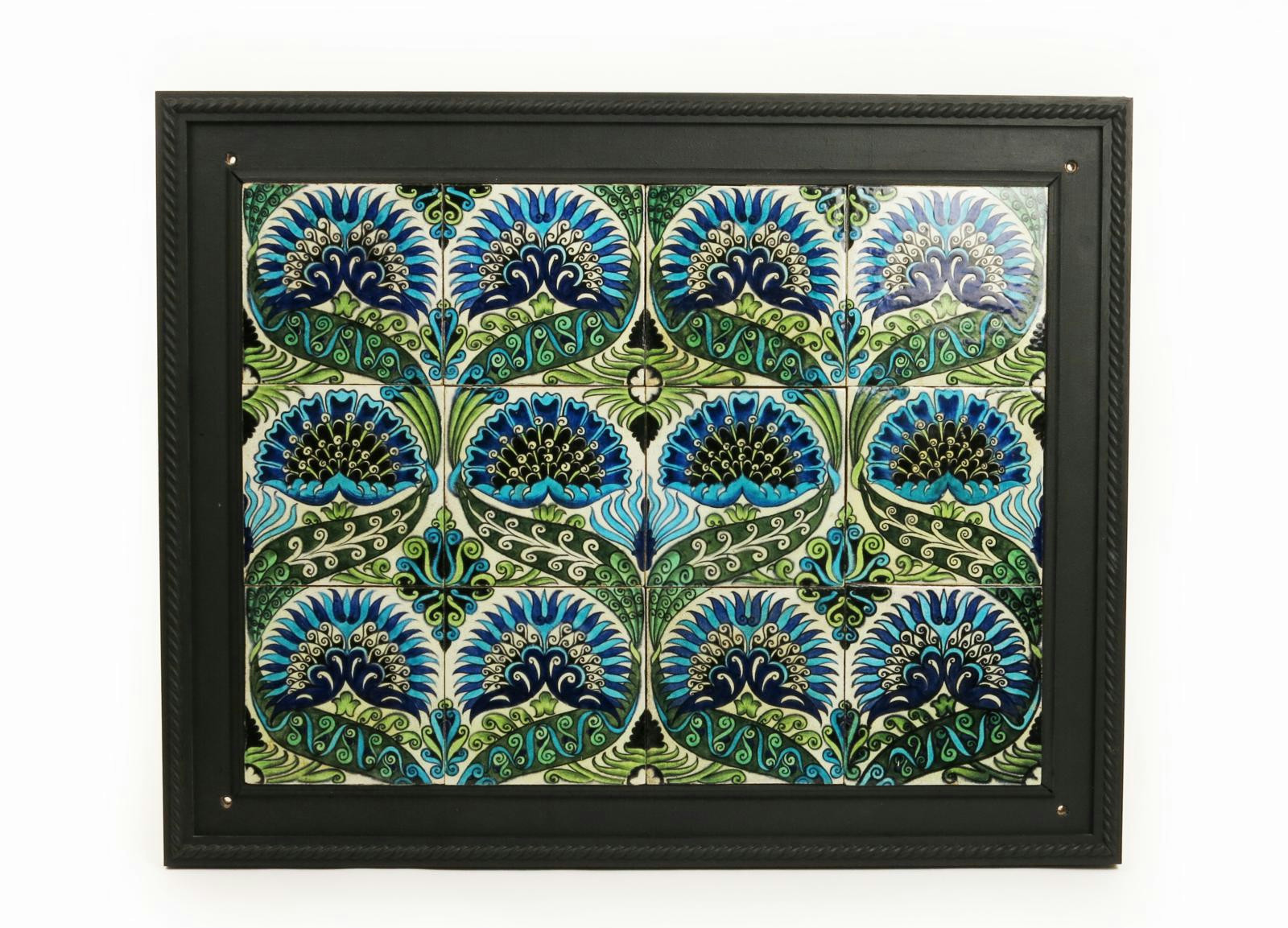 A William De Morgan Mongolian twelve tile panel, painted in colours on a white ground, framed, 75 x 60cm, each tile 15.5cm. square