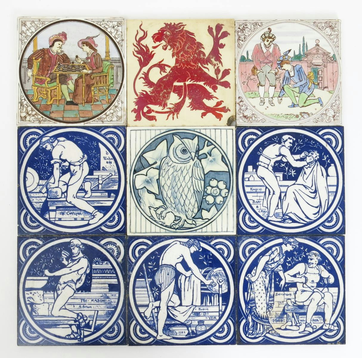 A large collection of tiles, including a Maw & Co ruby lustre tile designed by Lewis F Day, decorated with a heraldic lion, three Minton's tile decorated with bird roundels in blue on a cream ground, two tiles printed with medieval sporting scenes, and a large collection of Minton Tiles designed by John Moyr Smith, various marks, damages 15.5cm. high