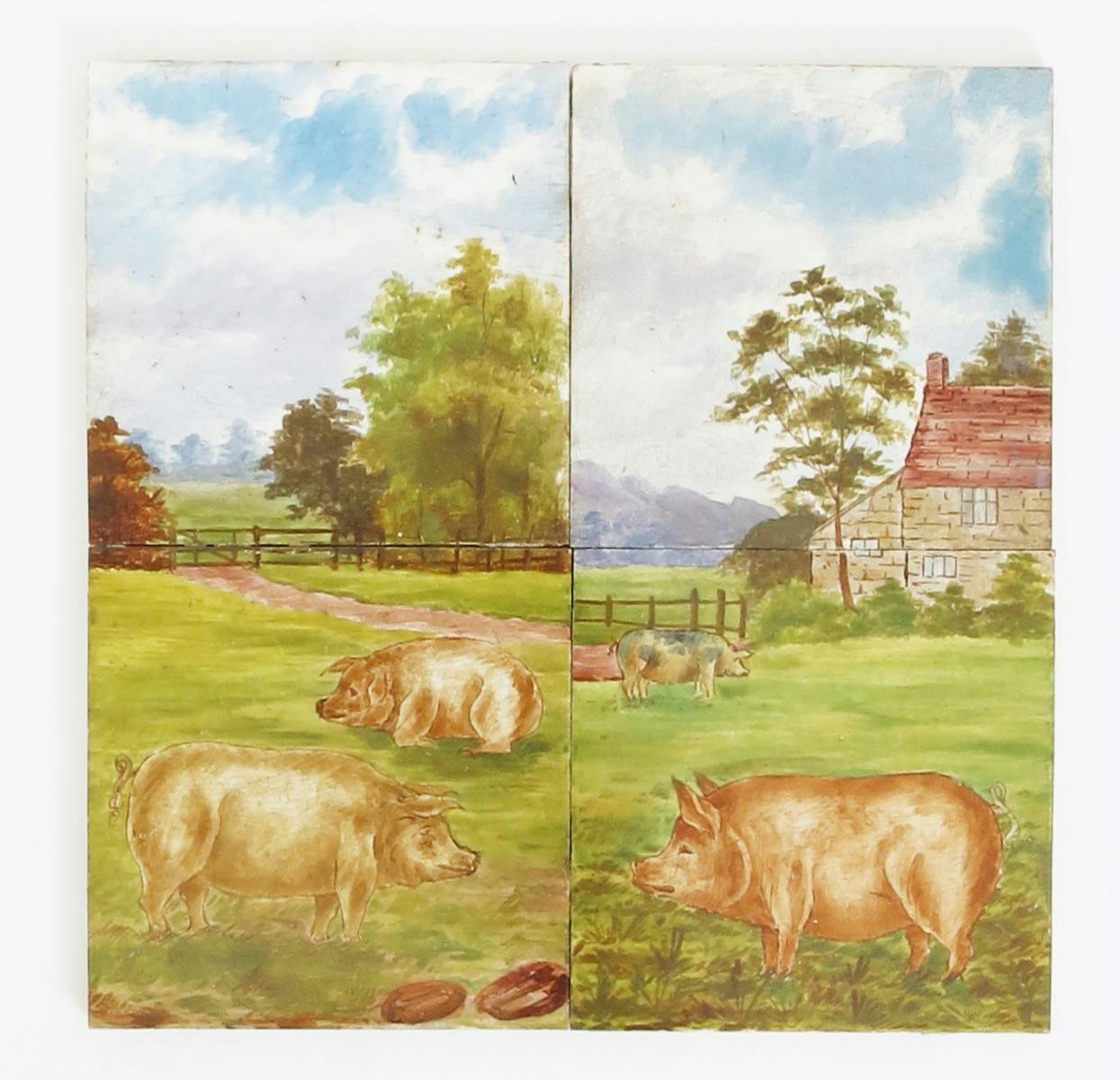 Six Craven Dunnill two tile panels of rare breed pigs, painted in a farm landscape, in colours impressed marks to reverse, damages 15.5cm. square tiles