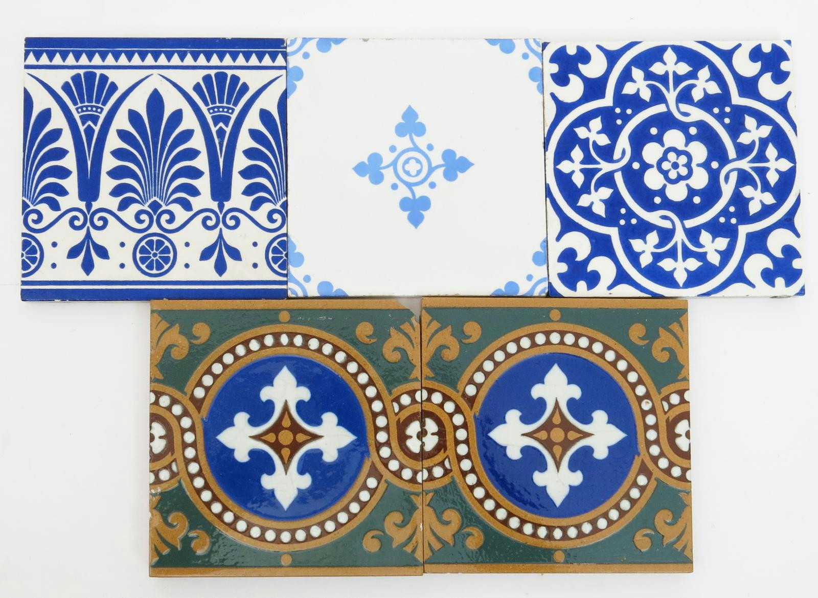 A Prosser's Patent Minton & Co tile designed by A.W.N Pugin, printed in pale blue with simple foliate panel, on a white ground, two other Minton's tiles and two Maw & Co encaustic tiles impressed marks, minor rim chips, 15cm. square