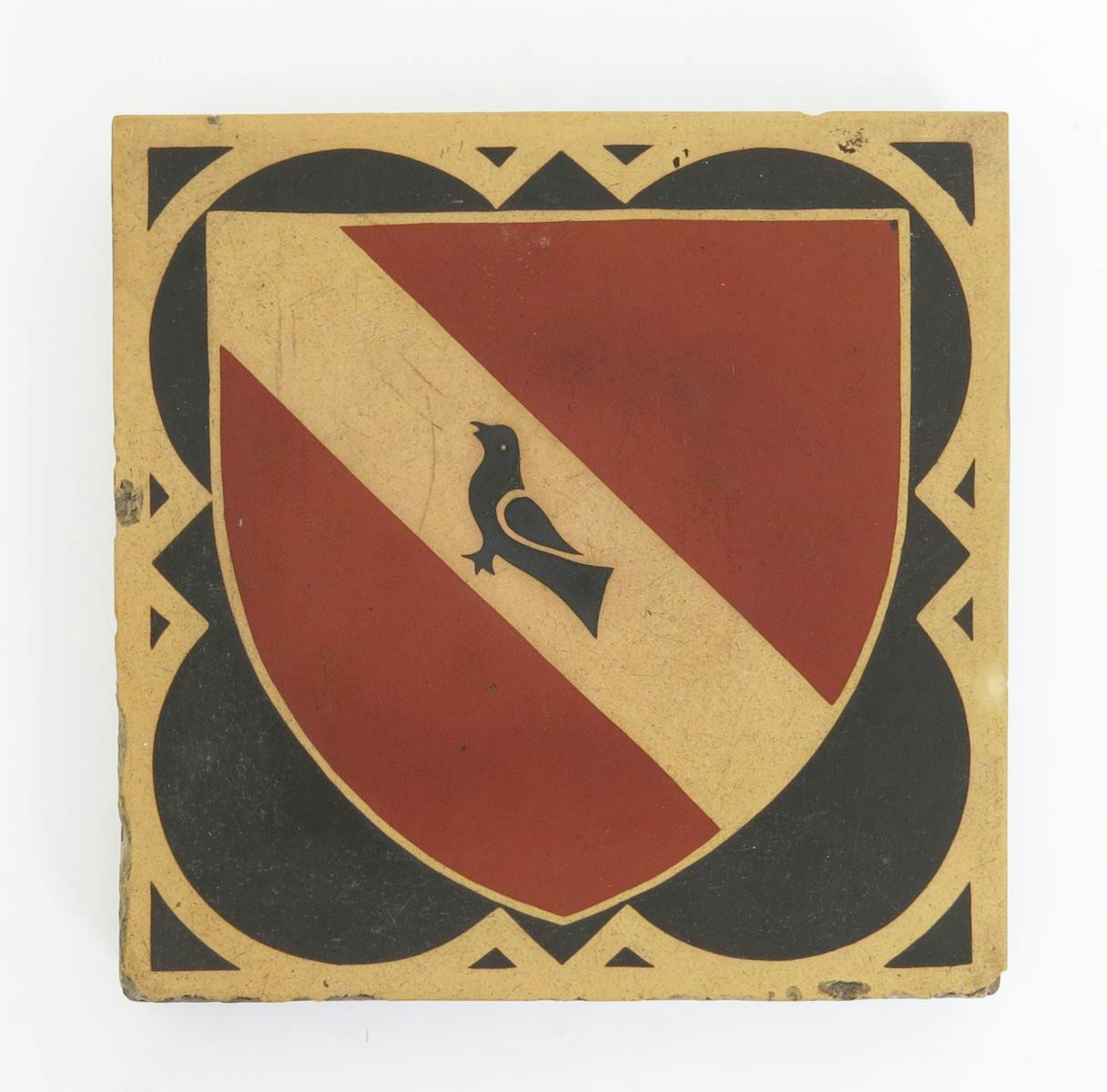 A Minton's encaustic tile designed by A.W.N Pugin for St Augustine's Ramsgate, decorated with a black bird in a red shield, martlett emblem unsigned 15.5cm. square