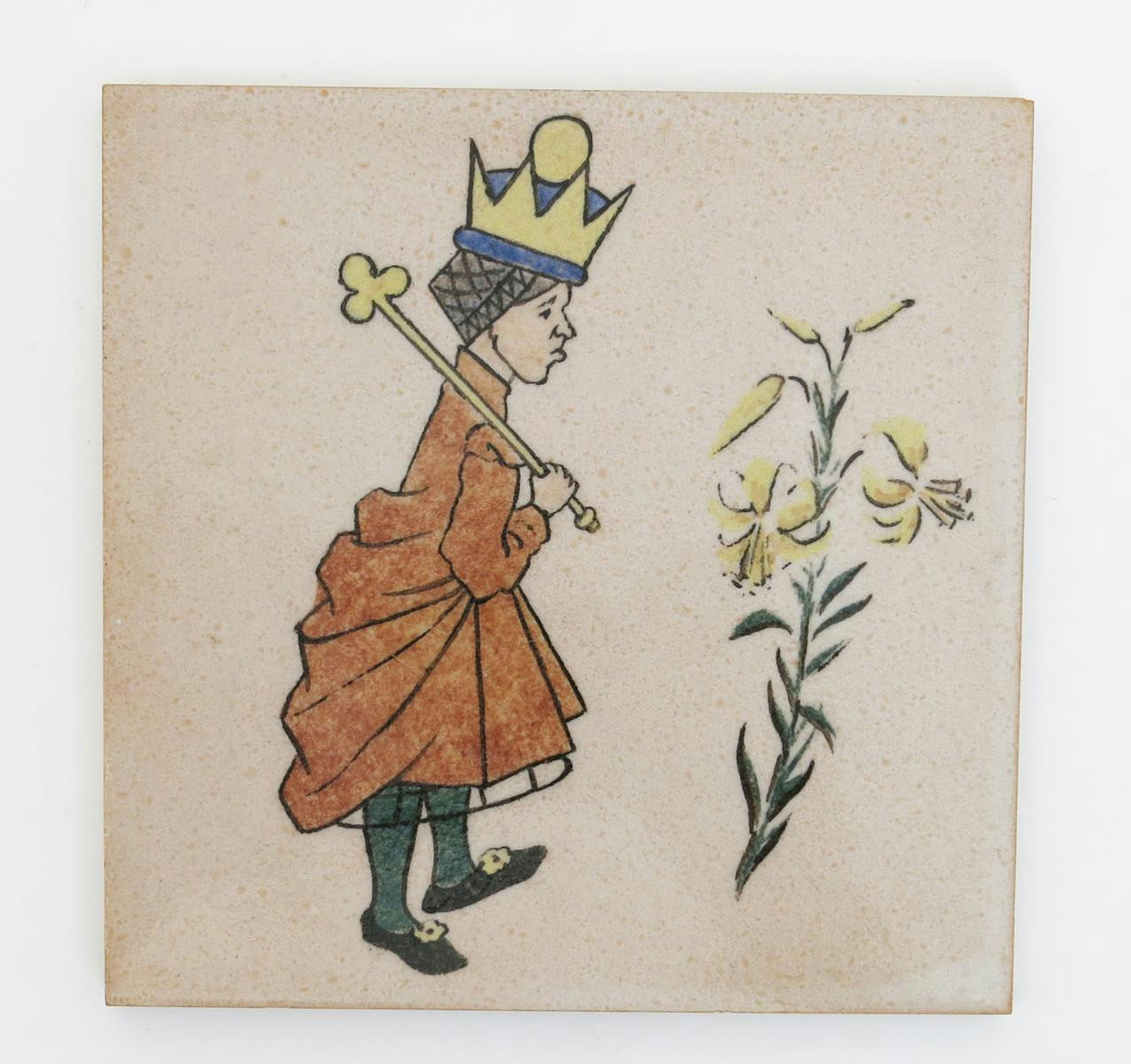 A Dunsmore Alice in Wonderland tile designed by C.F.A Voysey, printed in colours with the Queen, on a speckled off white ground impressed marks, for Wooliscroft blank 15cm. square