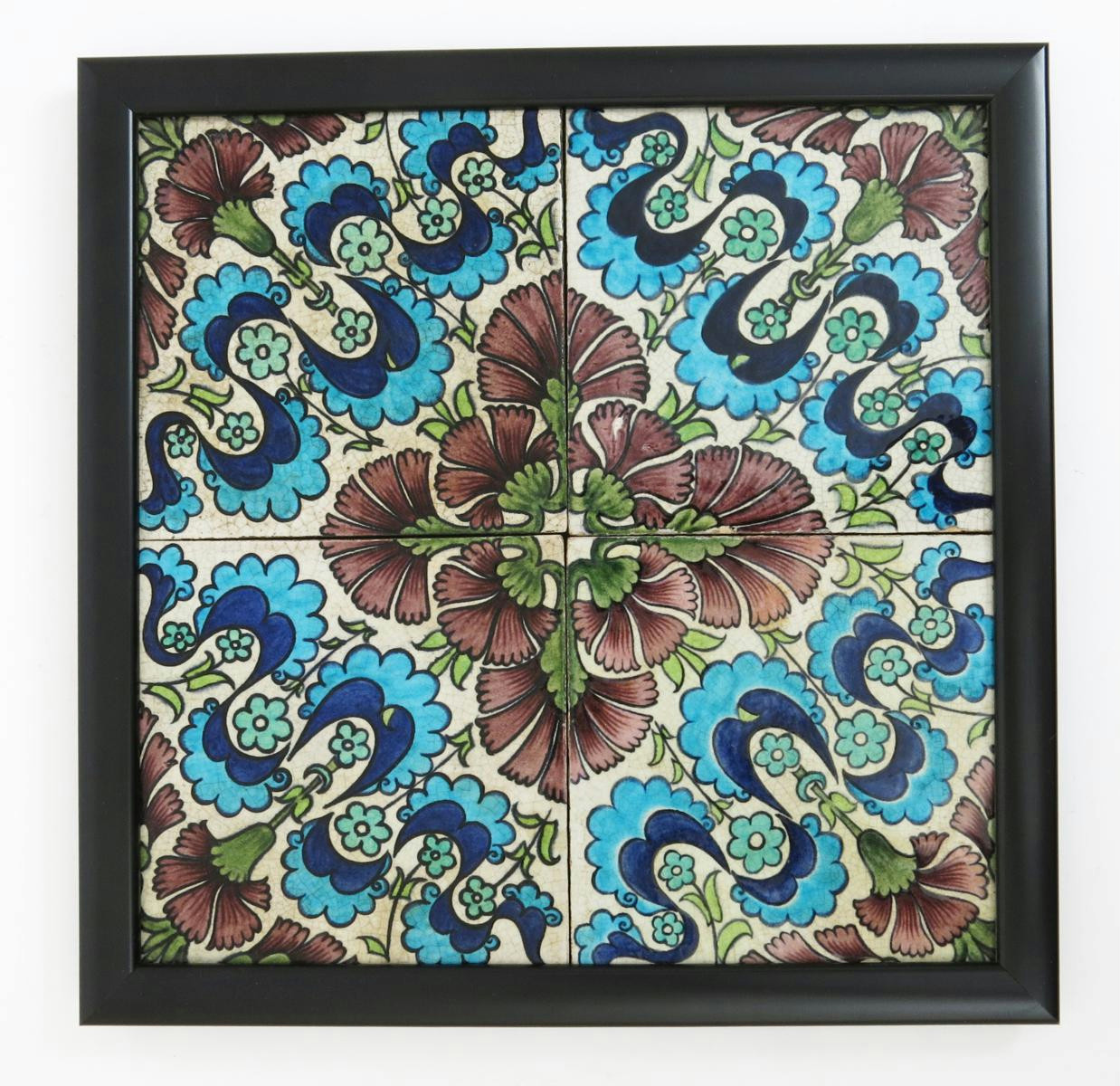A William De Morgan Persian four tile panel, painted with carnations in shades of aubergine, green, blue and turquoise on a white ground, framed, repair to one corner, 31cm. square
