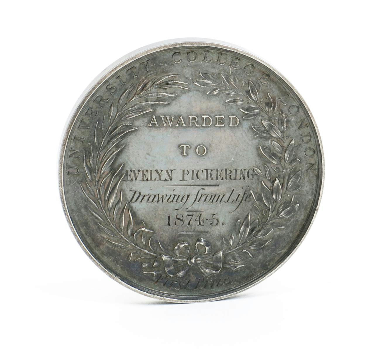 A University College London commemorative silver medal awarded to Evelyn Pickering, (Evelyn De Morgan), Drawing from Life class, 1st prize, dated 1874-75, 4cm. diam.