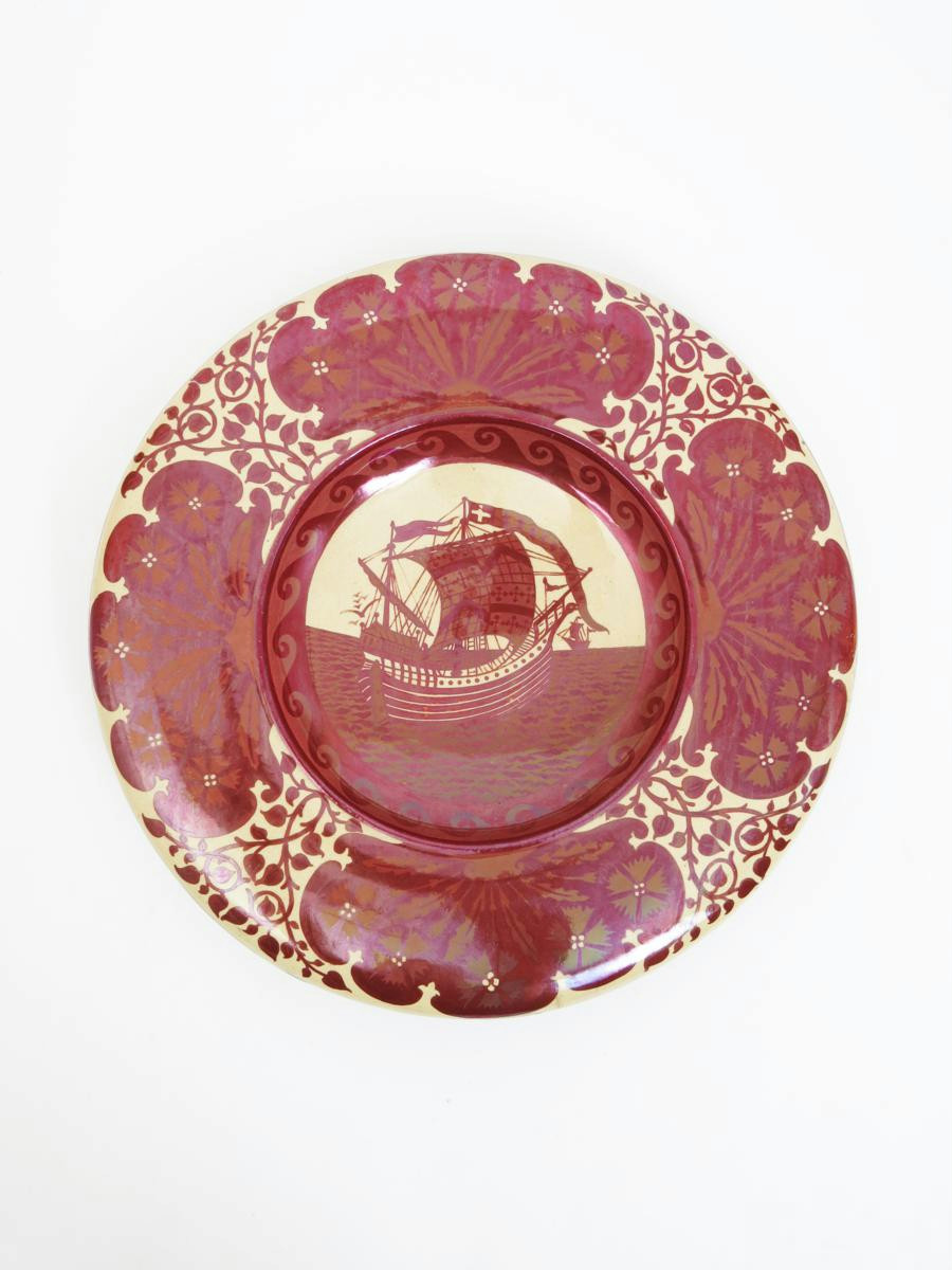 A fine Maw Jackfield charger, painted to the well with a galleon at full sail, another sailing into the distance, the rim a border of carnation flowers, in a rich ruby lustre on cream ground, the three hanging holes modelled as bearded mask, painted Camel MJ mark, chips to rim, 47cm. diam.