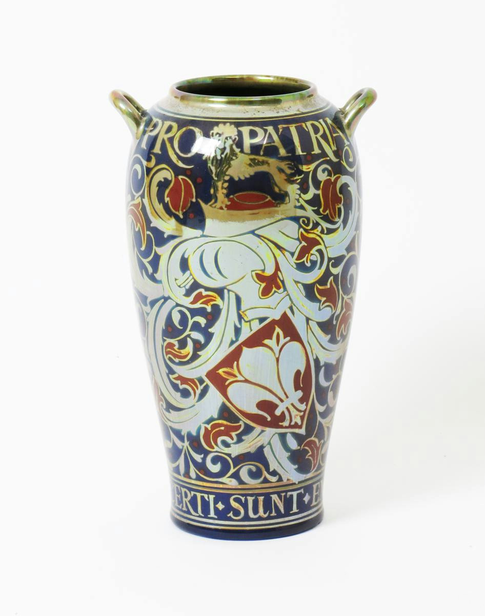 A Pilkington's Lancastrian twin-handled vase by William S Mycock, dated 1913, shouldered form painted with heraldic fleur de lys and Maltese cross on a shield, in ruby and copper lustre on a blue lustre ground, inscribed Pro Patria in gold impressed marks, painted artist cipher and date code 21,5cm. high