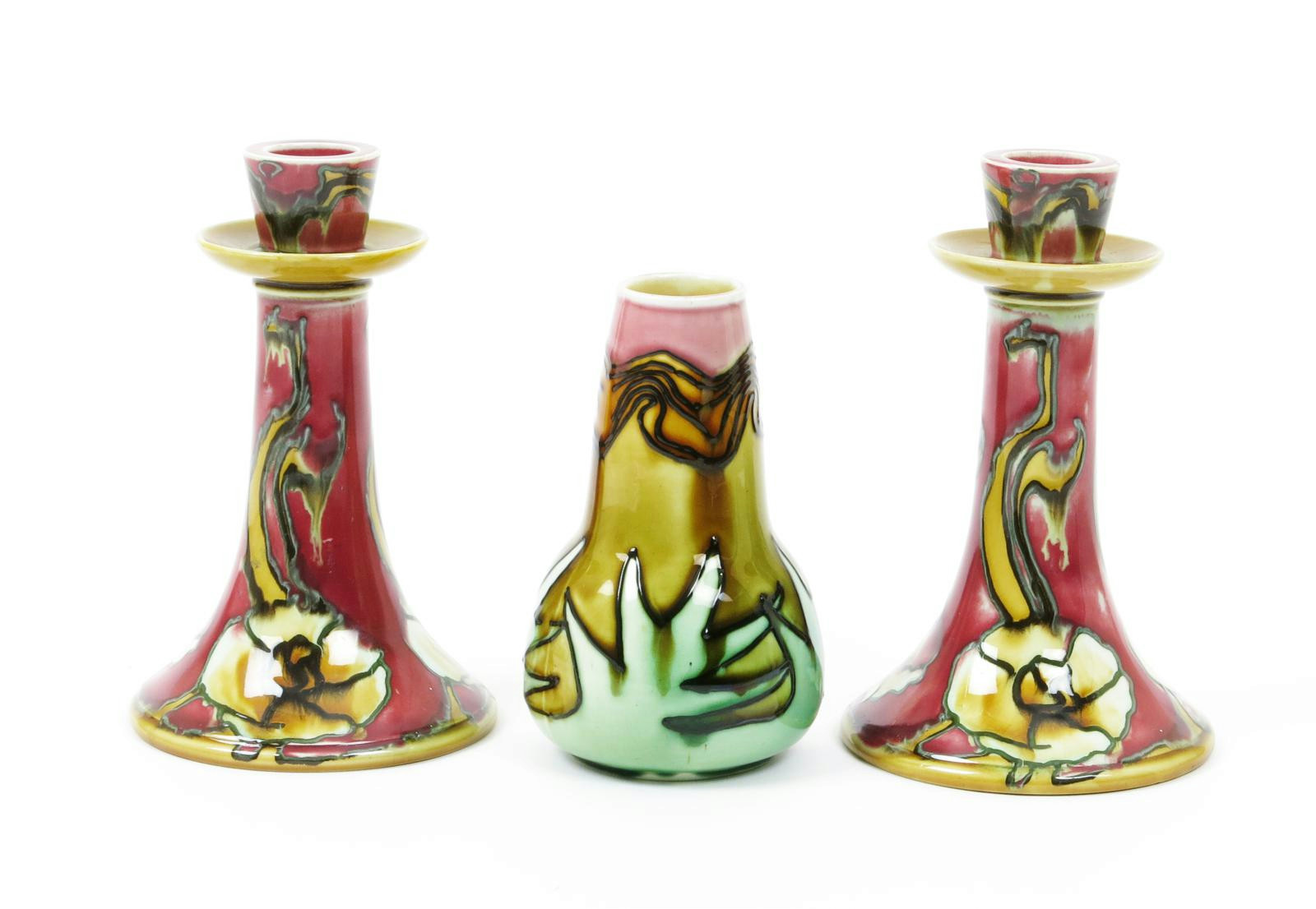 A pair of Minton Secessionist candlesticks designed by Leon Solon and John Wadsworth, painted with flowers in shades of green, ochre and red, with factory holes for electricity, and a Minton's Secessionist vase printed marks, hairline to one 16.5cm. high