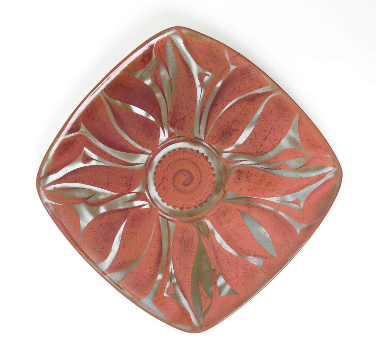 an Aldermaston Pottery platter, rounded, square section on four feet, painted with stylised flowerhead design in pink on a mottled white ground painted monogram, CA84 33cm. high