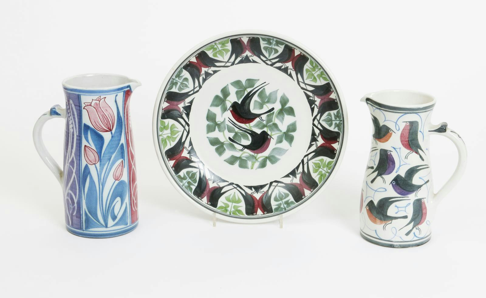 a stoneware plate, painted with two birds amongst foliage to the well, the rim a frieze of pairs of birds, in red, black and green on a white ground, and two tall jugs painted monograms 29cm. high