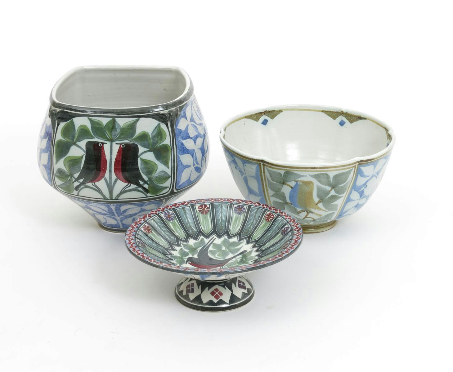 a stoneware tazza, painted with a bird amongst foliage inside radiating flower stems and foliage, in shades of black, green, pink and purple, and a Laurence McGowan fluted bowl and another footed bowl painted marks, 18cm. diam.