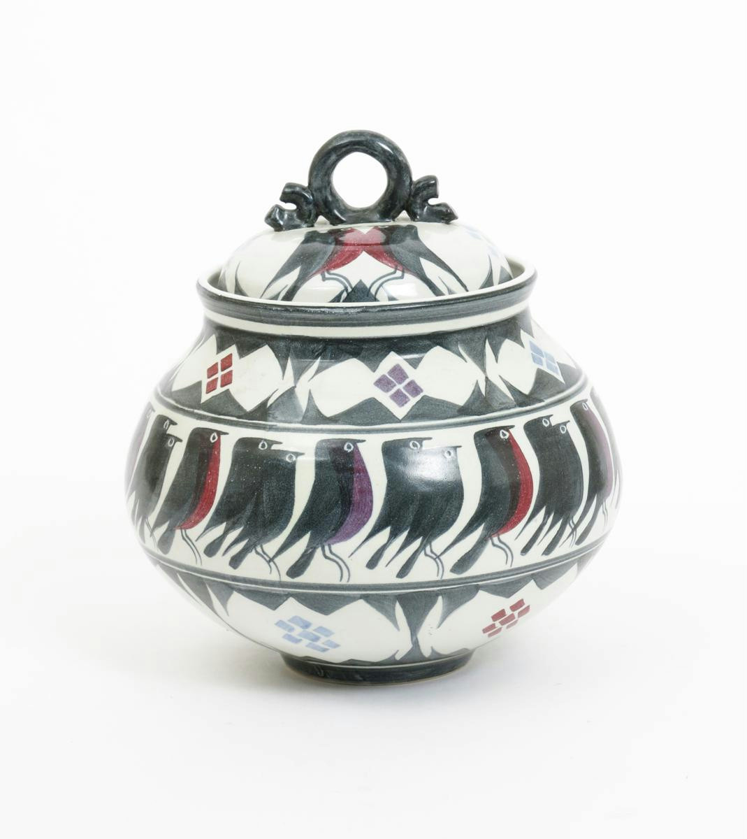 a stoneware vase and cover, painted with a frieze of marching birds, in shades of black, purple and red on a white ground painted monograms 21cm. high