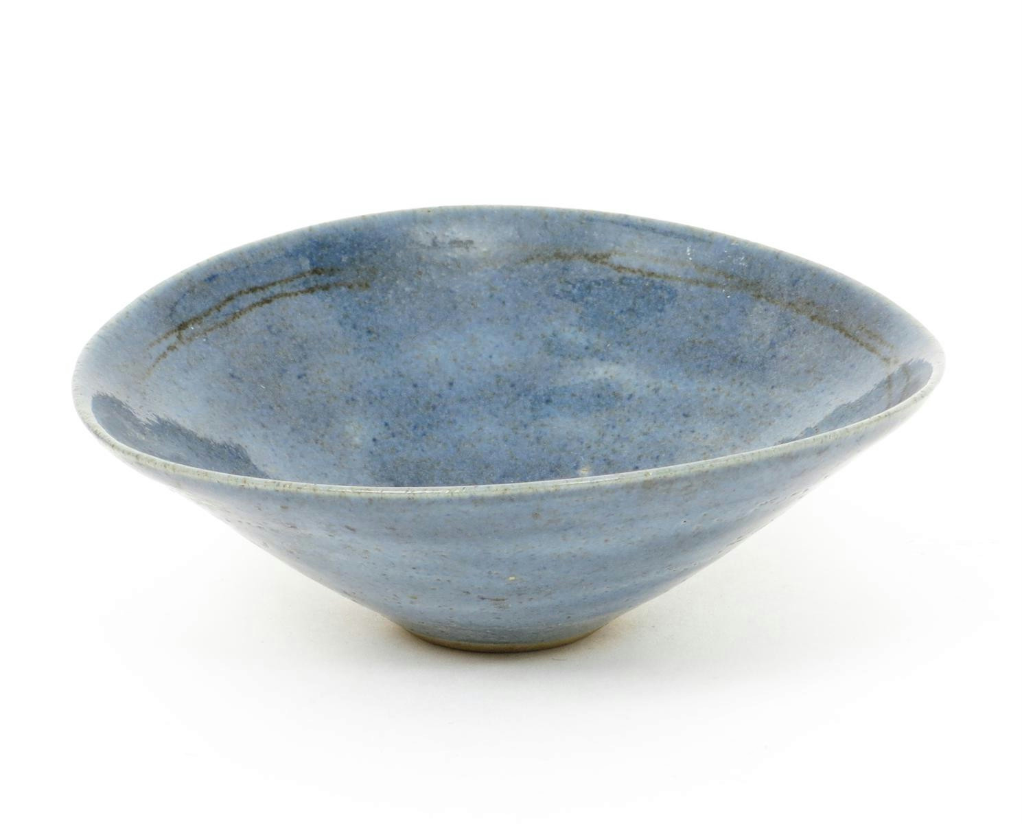 a small stoneware bowl, flaring conical form covered in a speckled blue glaze, the interior with two simple painted black bands impressed seal mark 13cm. wide