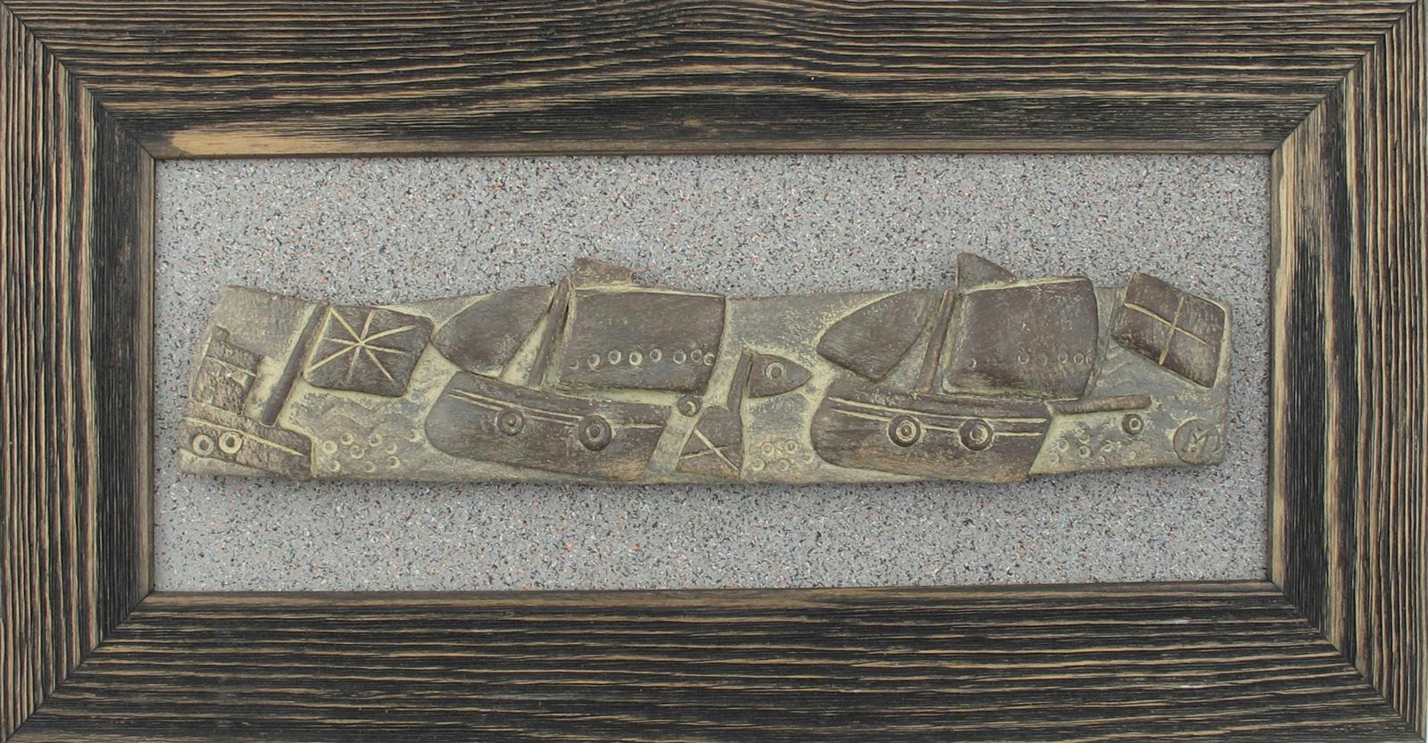 Two Ships, a rectangular pottery plaque, mounted and framed impressed seal mark, plaque 34cm. wide